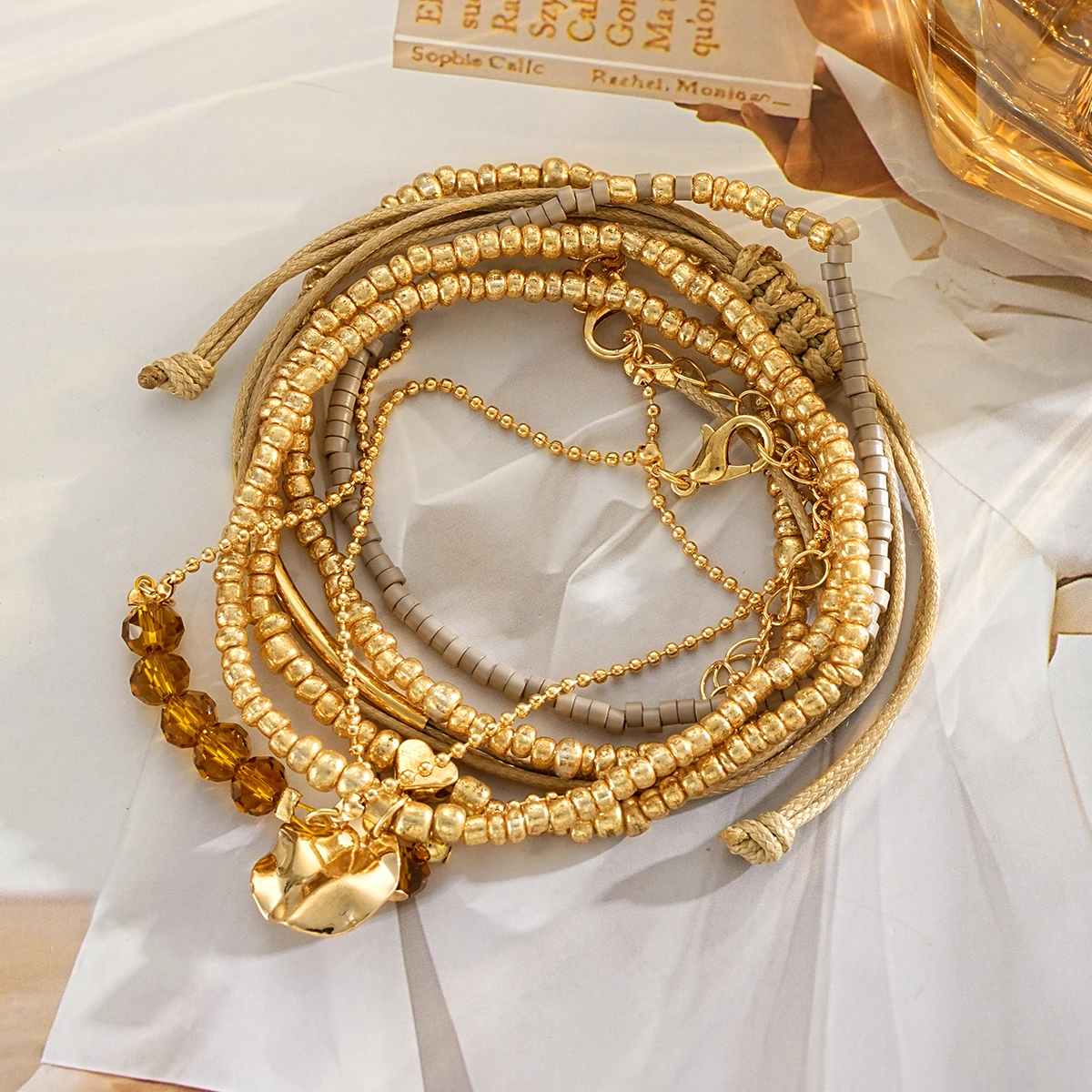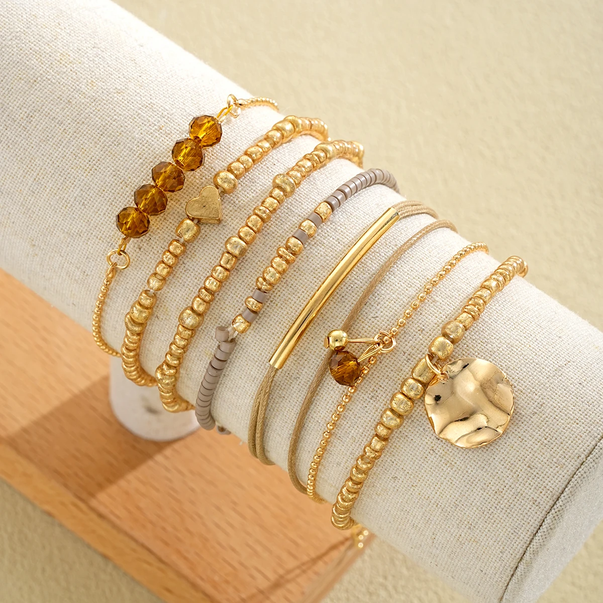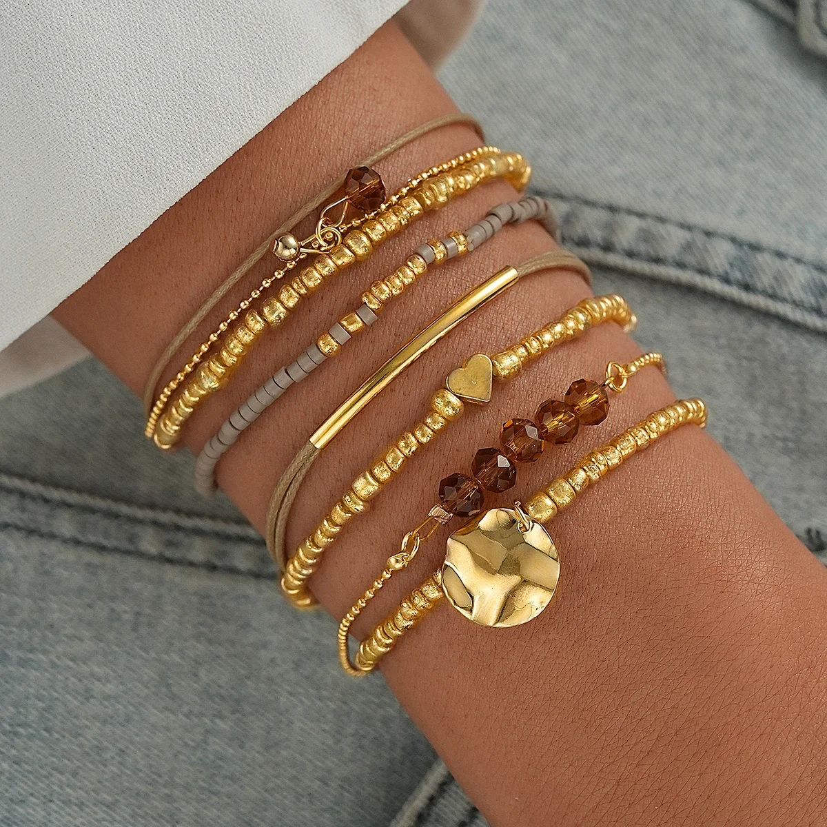 7Pcs Set Bohemian Heart Beads Bracelets For Women With Crystal Round Pendants Elastic Stretch Jewelry Gift