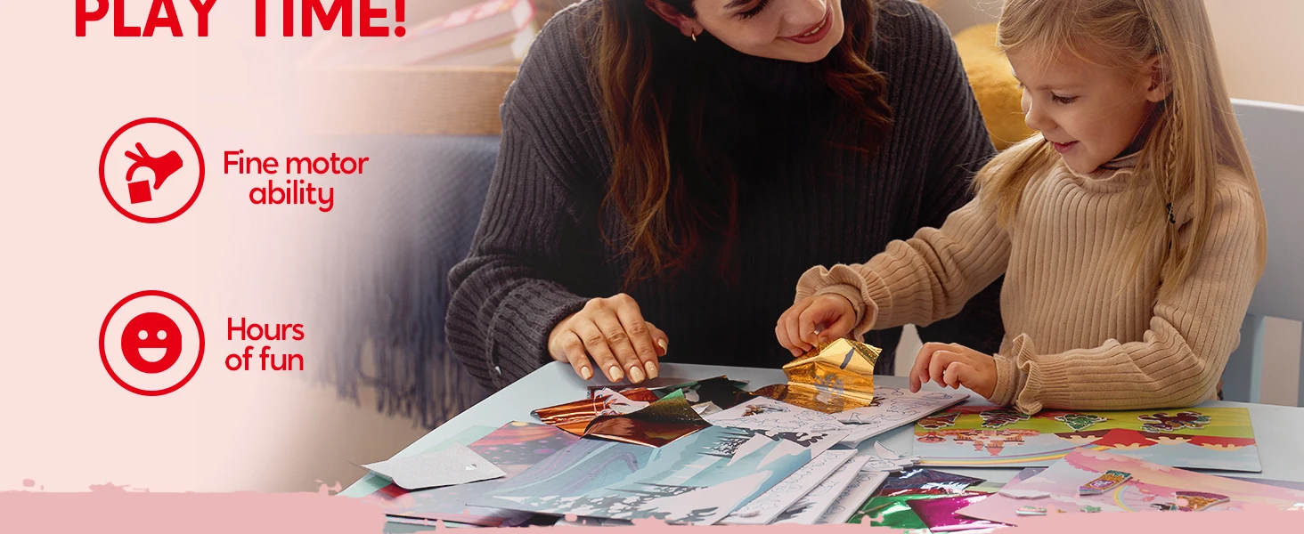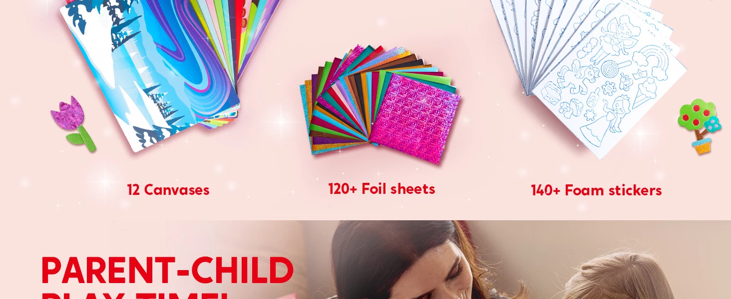 NO-MESS, NO-GLUE: Immerse yourself in an effortless creative experience by simply selecting a picture canvas and adorning it with vibrant foil sheets using the provided stickers. This is a mess-free and glue-free activity, ensuring kids remain engaged and entertained at home, during playdates, art classes, or even in the classroom, without any concerns about untidy aftermaths.